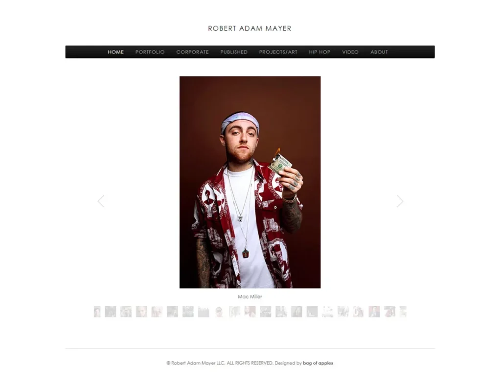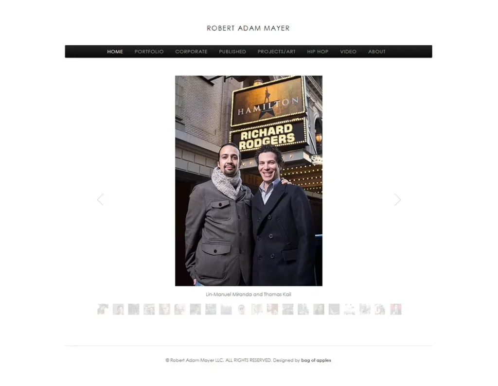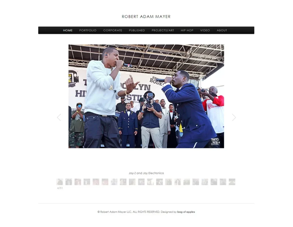A clean, image-forward portfolio site built around Rob’s photography. Strong visual presentation of his portrait and editorial work, with clear sections for his biography, credits, and client history. The design steps back and lets the images lead — because when your subjects include JAY-Z, Nas, and a mural at the 9/11 Museum, the work speaks for itself.